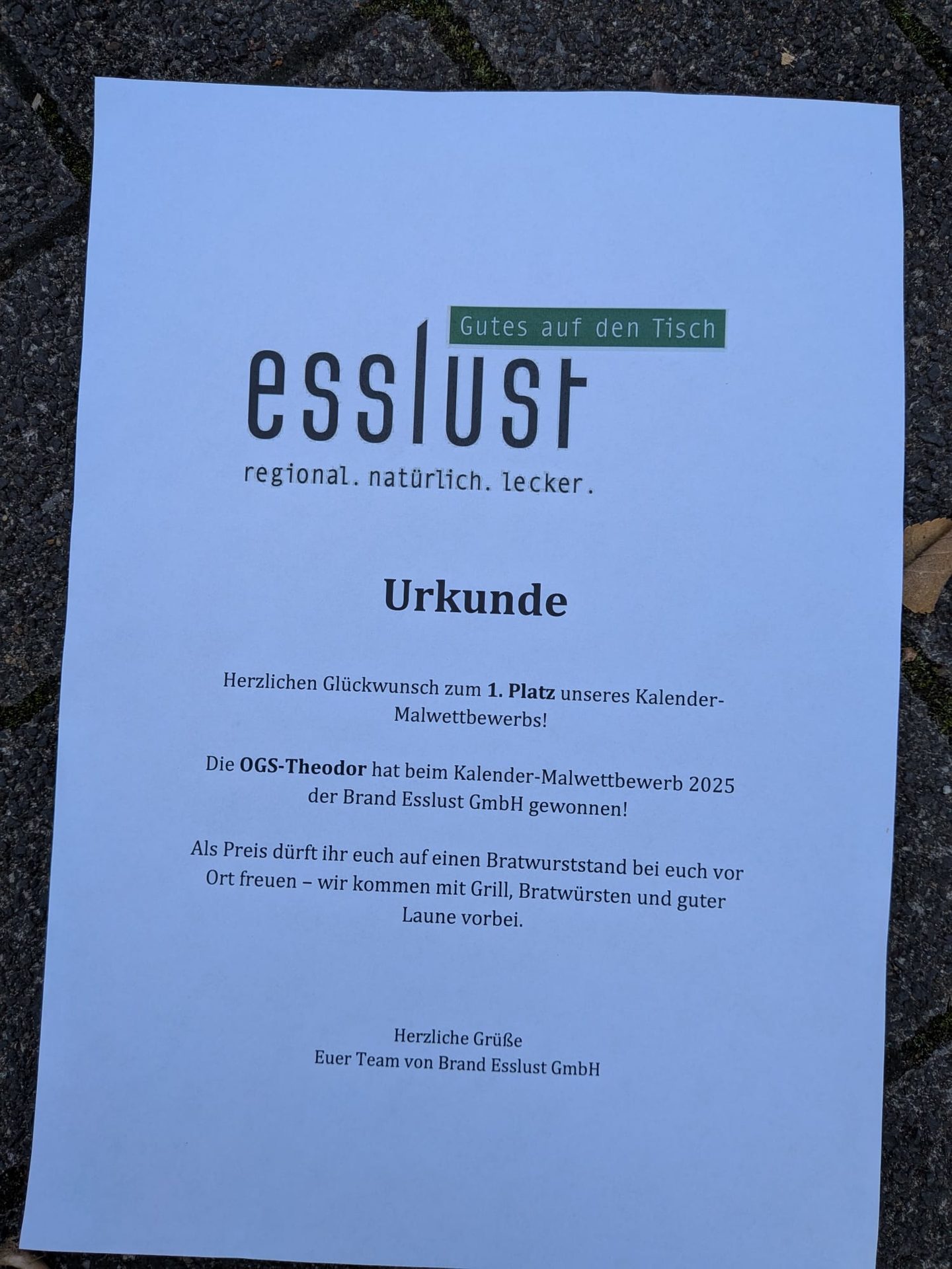 Große Freude an unserer Schule: Die OGS des Standort Theodor hat beim Kalender-Malwettbewerb der Firma Esslust den 1. Platz belegt! Mit viel Kreativität und tollen Ideen überzeugten unsere Kinder die Jury – als Belohnung gab es einen ganz besonderen Preis: einen Bratwurststand direkt vor Ort!