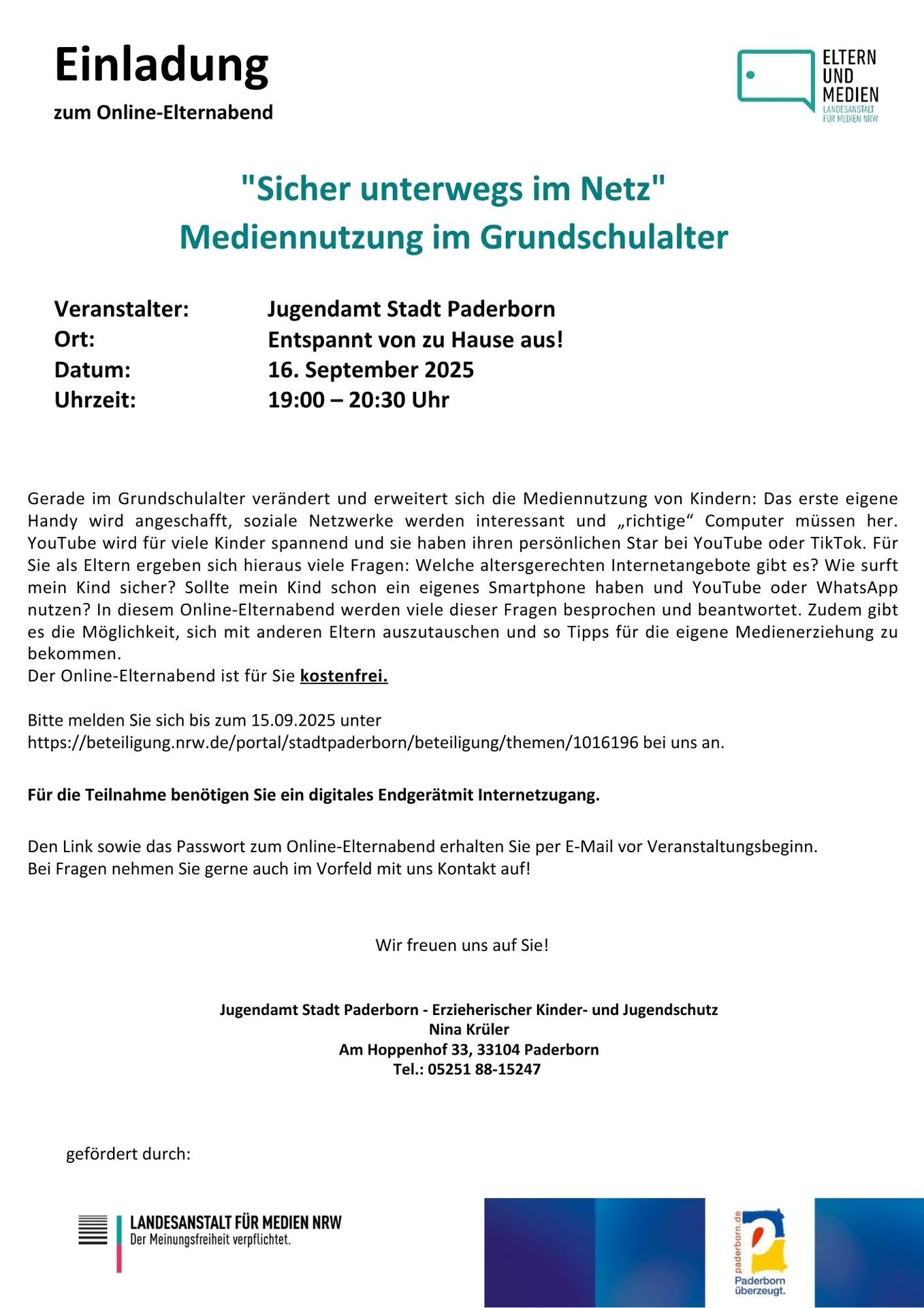 Sie befinden sich hier:StartseiteUnsere Angebote und HilfenDas Kinder- und JugendbüroErzieherischer Kinder- und JugendschutzPrävention von CybermobbingAktuelles Aktuelles Der kostenfreie Online-Elternabend findet am 16.09.2025 in der Zeit von 19:00 - 20:30 Uhr statt. Online-Elternabend© Stadt PaderbornKontaktKinder und JugendbüroNina KrülerAm Hoppenhof 3333104 PaderbornTelefon: 05251/88-15247E-Mail: n.kruelerpaderbornde