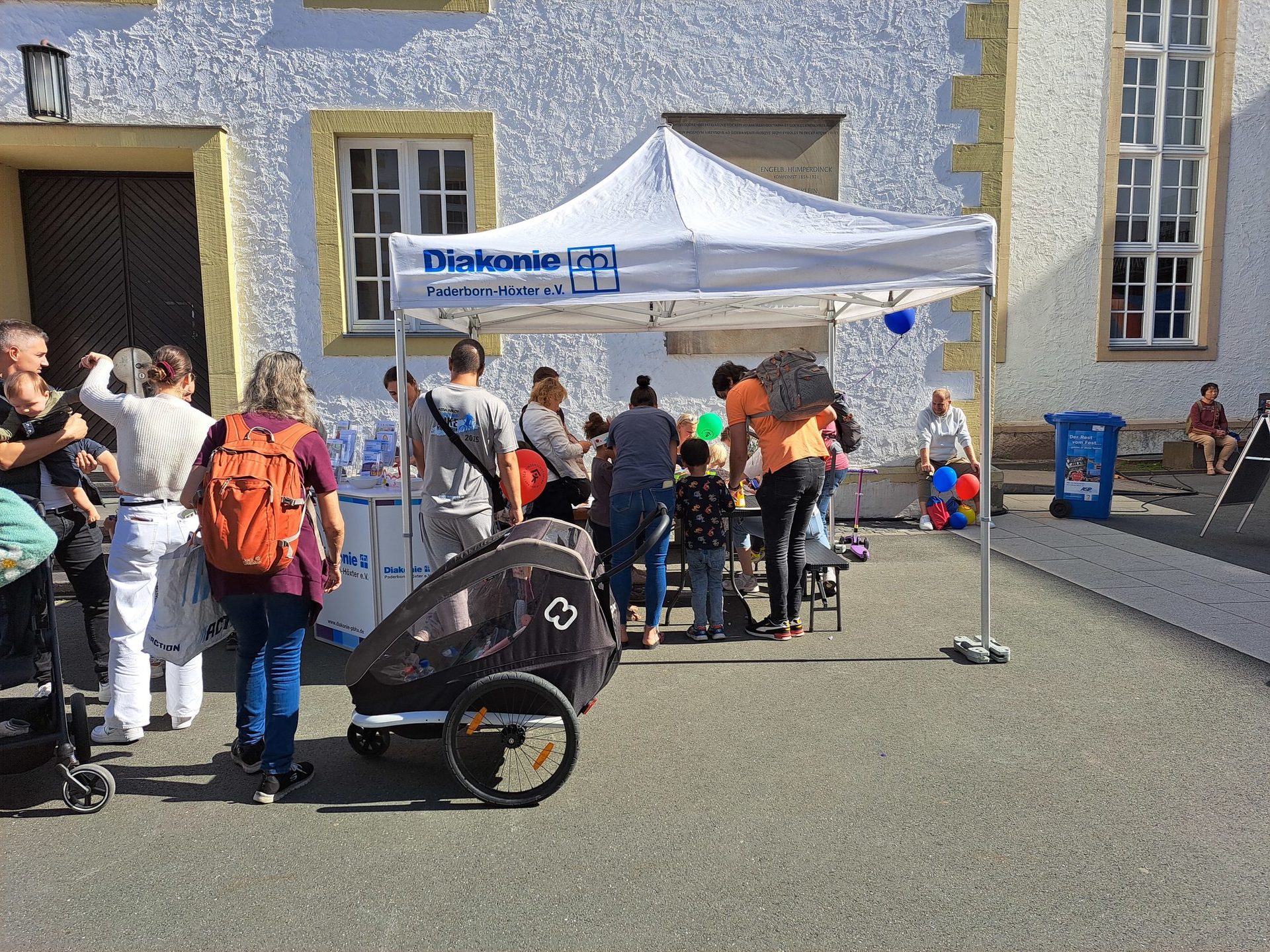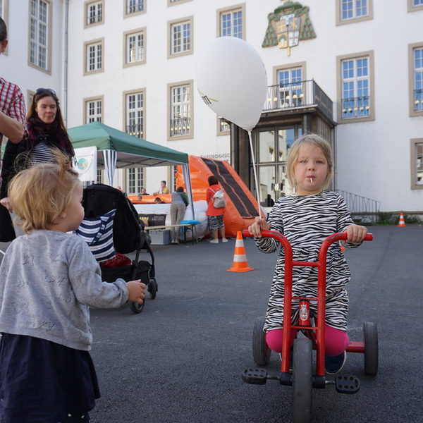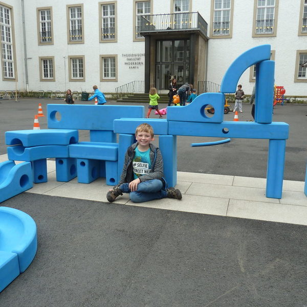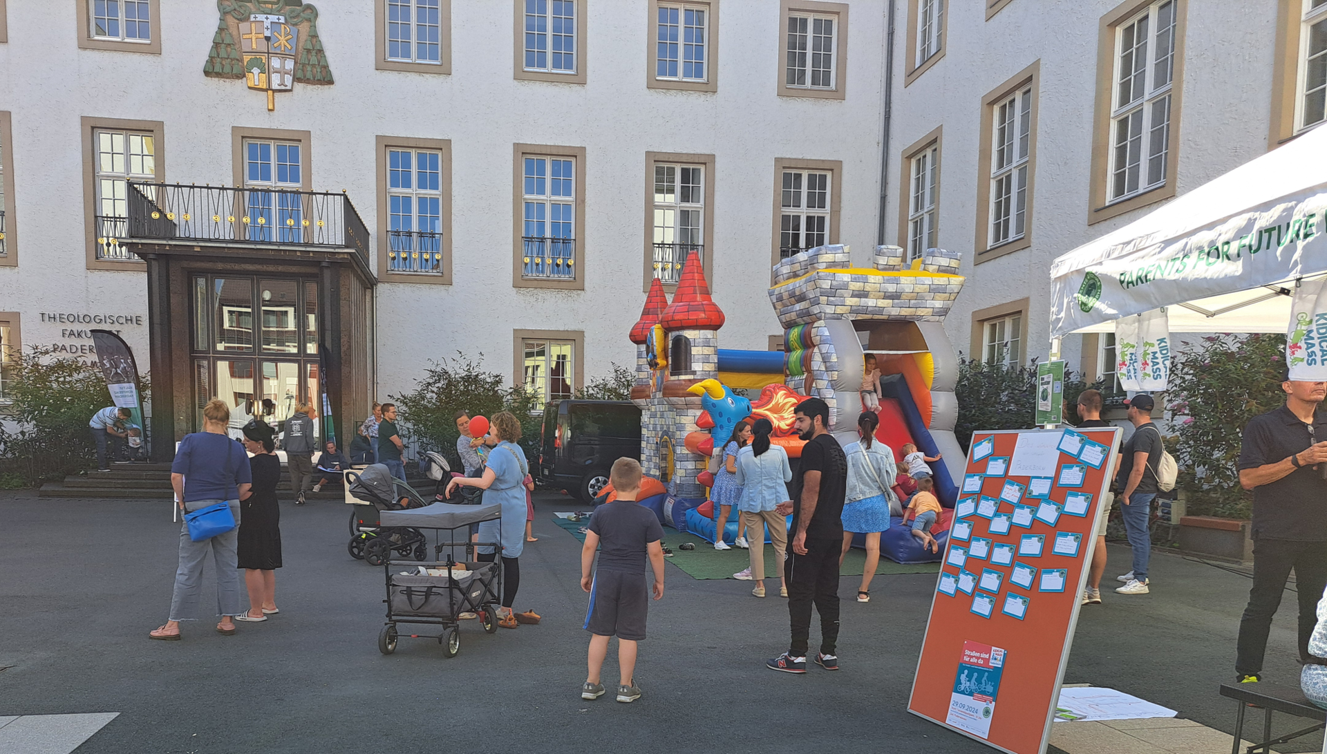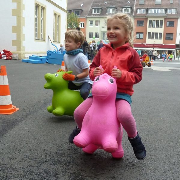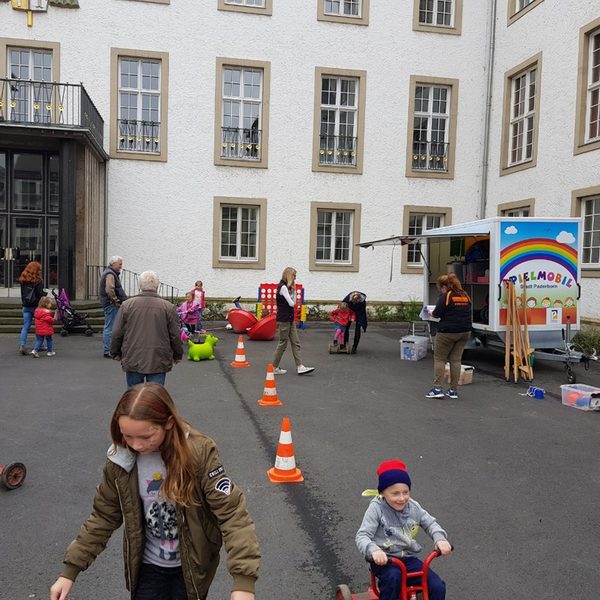 Gleichzeitig startete auch ein Kinderfest auf dem Schulgelände des Theodorianums. Dort machte sich das Motto „Kinder brauchen Freiräume“ alle Ehre. Durch eine riesen Abenteuerhüpfburg in Form eines Piratenschiffs und der Windelpirateninsel für kleine Kinder durften kleine und große Weltentdecker ihrer Phantasie und Kreativität freien Lauf lassen. Zudem bot auch der SC Grün/Weiß Paderborn, Fools Unlimited- Verein für Zirkuskunst, BUND, der FUD, die städtischen und katholischen Kitas und das städtische Spielmobil Spiel- und Spaß an. Im Fokus standen das Balancieren auf einer Slackline, Akrobatik, Kinderschminken und das Erbauen von Nistkästen für Vögel.