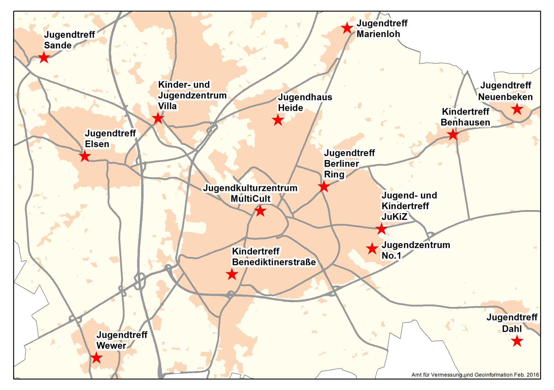 Die Kinder- und Jugendtreffs verteilen sich auf die Kernstadt und nahezu jeden Stadtteil. In der Kernstadt gibt es vorwiegend größere Einrichtungen, in den Stadtteilen hingegen vermehrt kleinere Einrichtungen. Die größte städtische Jugendeinrichtung ist das Jugendkulturzentrum MultiCult, welches sich direkt im Stadtkern befindet und einen kulturpädagogischen Schwerpunkt hat. Von den 14 Einrichtungen sind 12 Einrichtungen Kinder- und Jugendtreffs und zwei Einrichtungen Kindertreffs, in denen ein stadtteilbezogenes Angebot für Kinder vorhalten wird. Alle Einrichtungen fungieren als eine Anlaufstelle innerhalb des Sozialraums. Kinder und Jugendliche finden in den Jugendtreffs kompetente Ansprechpartner/innen für alle Belange ihrer Lebenswelt und einen Ort, an dem sie ihre Freizeit aktiv gestalten und an verschiedenen Angeboten teilnehmen können. Zudem wird im Sozialraum Lieth/ Kaukenberg/ Goldgrund mobile aufsuchende Jugendarbeit angeboten.