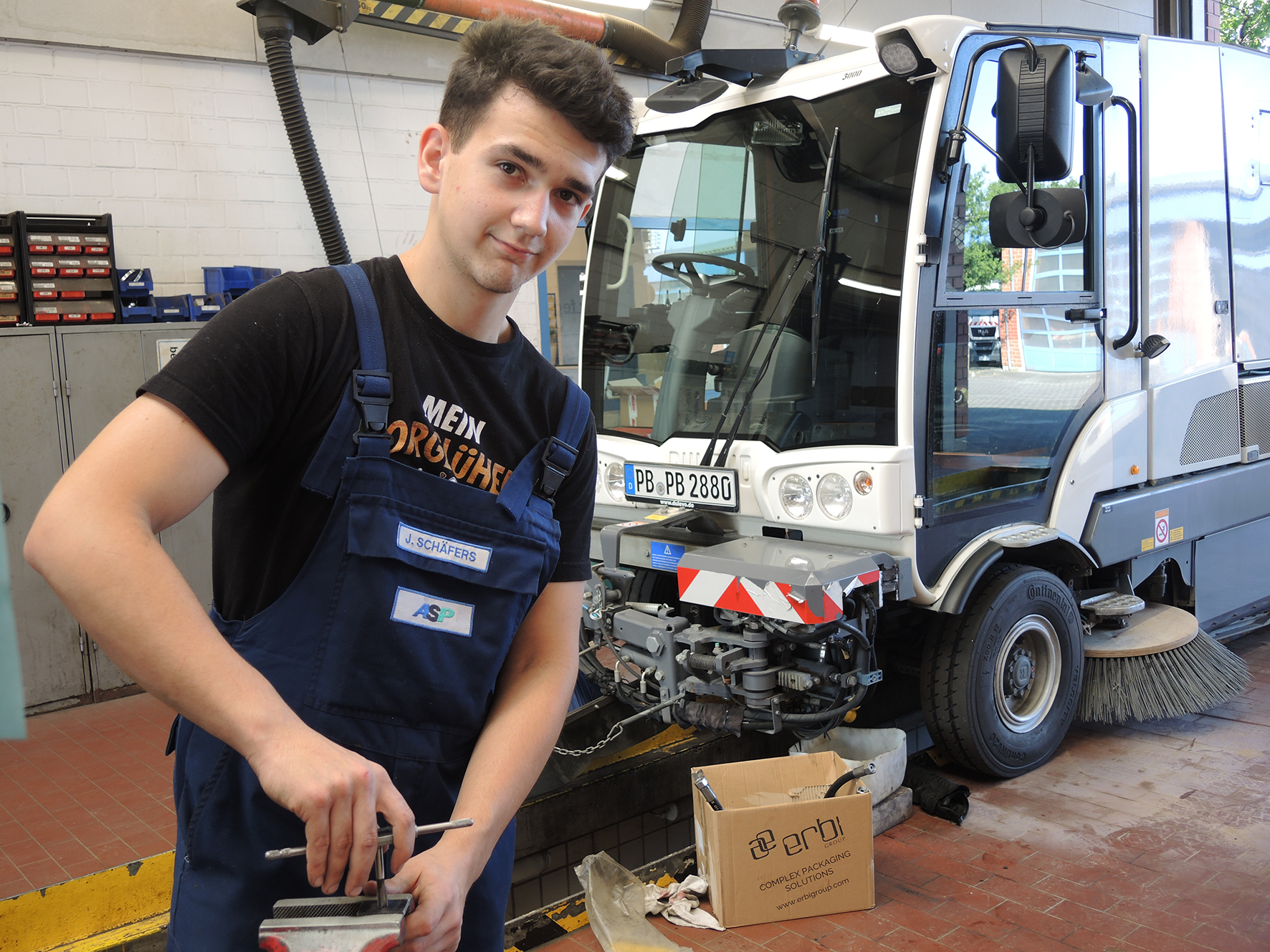Seit dem 1.8.2020 mache ich beim ASP eine Ausbildung zum KFZ-Mechatroniker. Die Arbeit mit den vielen verschiedenen Fahrzeugen und Gerätschaften ist sehr vielfältig und spannend. Man bekommt sofort interessante und abwechslungsreiche Aufgaben und ist im Team integriert.