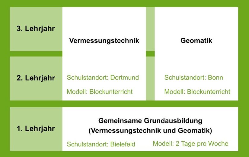Die theoretische Ausbildung erfolgt im 1. Ausbildungsjahr an 1-2 Tagen in der Woche am Carl-Severing-Berufskolleg (Öffnet in einem neuen Tab) für Handwerk und Technik in Bielefeld und ab dem 2. Ausbildungsjahr am Fritz-Henßler-Berufskolleg (Öffnet in einem neuen Tab) in Dortmund im Blockunterricht. Die praktische Ausbildung findet im Amt für Vermessung und Geoinformation der Stadt Paderborn statt. Darin enthalten ist ein dreimonatiger Ausbildungsabschnitt beim Katasteramt des Kreises Paderborn.