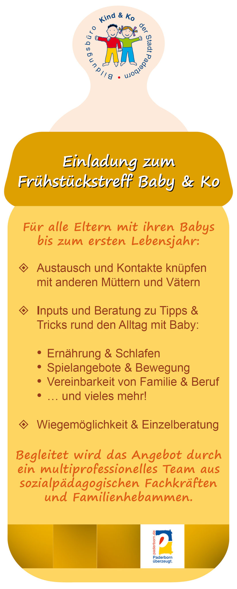 Das familienfreundliche Angebot Frühstückstreff Baby & Ko ist aus dem Netzwerk „Rund um die Geburt“ des Bildungsbüros Kind & Ko der Stadt Paderborn entstanden. Bei der Umsetzung erhält das Bildungsbüro Kind & Ko Unterstützung von engagierten Kooperationspartner/innen: