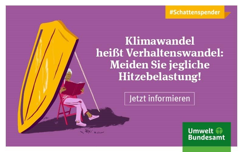 Das Umweltbundesamt hat sich der Herausforderung „Schatten spenden in heißen Zeiten“ gestellt und u.a. die Broschüre „Hitzknigge“ entwickelt. Hiermit unterstütz das Umweltbundesamt die Kommunen vor Ort, ihre Bürger*innen auf die Gefahren von Hitze hinzuweisen und praktische Verhaltenstipps zu geben. © Umweltbundesamt