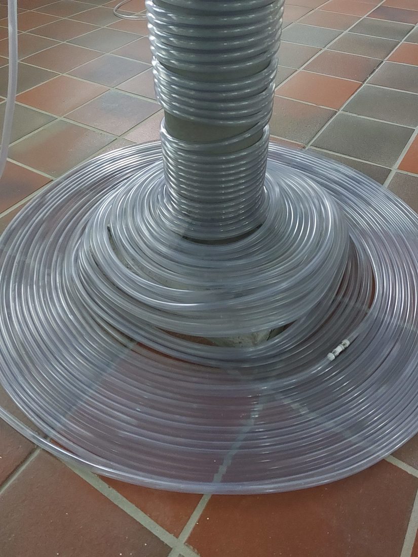 Von Wasser und Luftblasen durchflossene transparente Schläuche winden sich um Säulen des Marstalls, die je zu einer Art energetischen Spule werden. Vom Wasser umflossen, das durch die Schläuche schnellt, werden die Säulen zu vertikalen, scheinbar rotierenden Kraftfeldern, die den Raum rhythmisieren. Der Klang der Pumpen gehört wie die Bewegung des im Kreislauf fließenden Wassers zum Erfahrungsraum, den Claudia Schmacke mit ihrer Installation „coil“ erschafft.