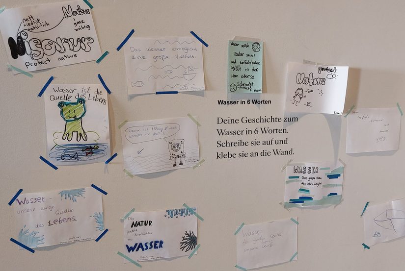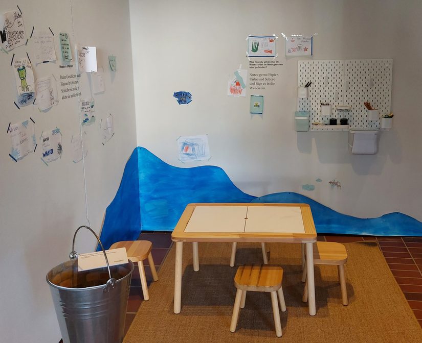 In unserer Mit-Mach-Ecke konnten sich kleine Besuchende zurückziehen und auf einer Lesecouch in spannende Geschichten zum Thema Meer und Wasser abtauchen. Kinder wurden ermutigt eine eigene Geschichte zum Thema Wasser zu schreiben und sie auf die Wand zu kleben, um die Ausstellung wachsen zu lassen.