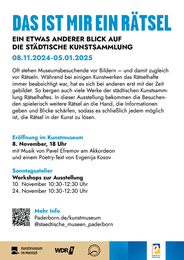 Die interaktive Ausstellung „Das ist mir ein Rätsel: Ein etwas anderer Blick auf die städtische Kunstsammlung” ist vom 8. November 2024 bis zum 5. Januar 2025 im Kunstmuseum im Marstall zu sehen.