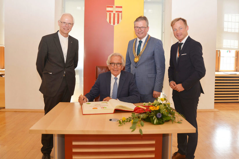 Als Ehrengast der Libori-Woche begrüßte Bürgermeister Michael Dreier am Dienstag, 30. Juli, Dr. Stephan Holthoff-Pförtner im historischen Rathaus. Der Minister für Bundes- und Europaangelegenheiten sowie Internationales des Landes Nordrhein-Westfalen war als Festredner des diesjährigen Tag des Landvolks in Paderborn zu Gast. Bei der traditionellen Veranstaltung im Paderborner Schützenhof sprach er zum Thema „Was nun Europa? – Herausforderungen und Perspektiven aus Sicht von NRW“. Zuvor trug sich Holthoff-Pförtner bei einem Empfang im Rathaus im Beisein von Bürgermeister Michael Dreier, Monsignore Uwe Wischkony, Direktor der Katholischen Landvolkshochschule Hardehausen, und Daniel Sieveke, Mitglied des Landtags Nordrhein-Westfalen, in das Goldene Buch der Stadt ein.