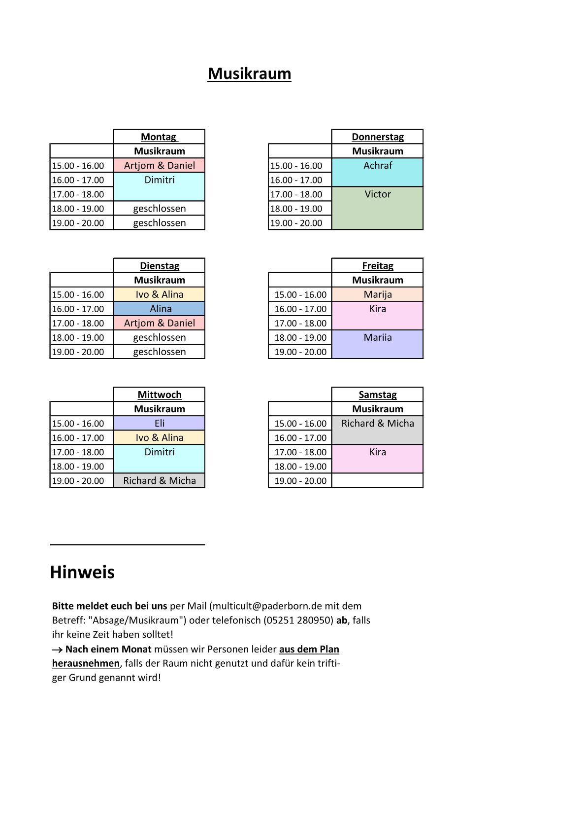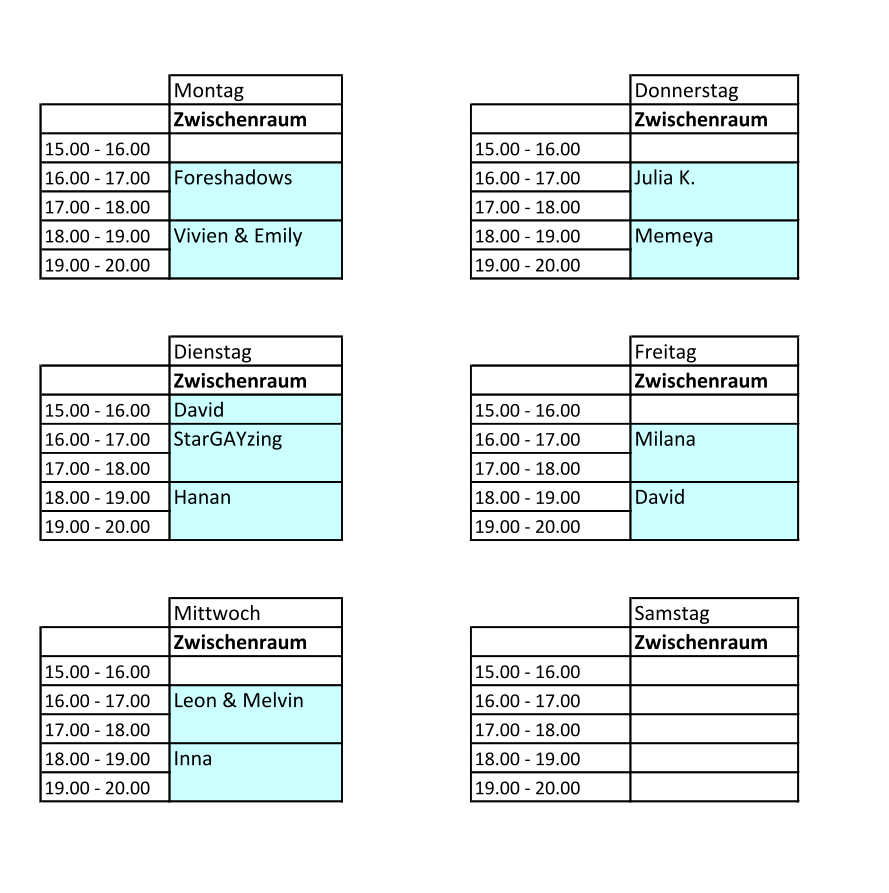 Falls ihr Interesse habt, einen dieser Räume regelmäßig zu nutzen, schaut gern, welche Felder noch leer sind und meldet euch bestenfalls persönlich bei uns!