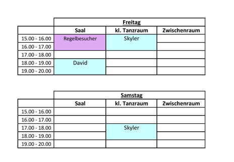 Hier findet ihr unsere Belegungspläne für den Musikraum und den Zwischenraum als Tanzmöglichkeit (aktuell sind der Saal und der kl. Tanzraum aufgrund des Wasserschadens nicht nutzbar).