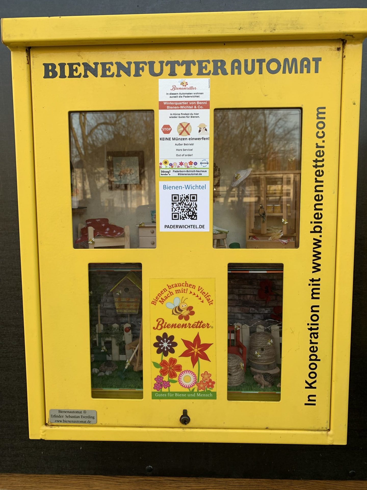 Ganz unbemerkt ist der Bienen-Wichtel in den Bienenfutterautomaten des Naturkundemuseums Paderborn eingezogen. Dort hat er sogar gleich vier kleine Zimmer in denen er sich häuslich eingerichtet hat.
