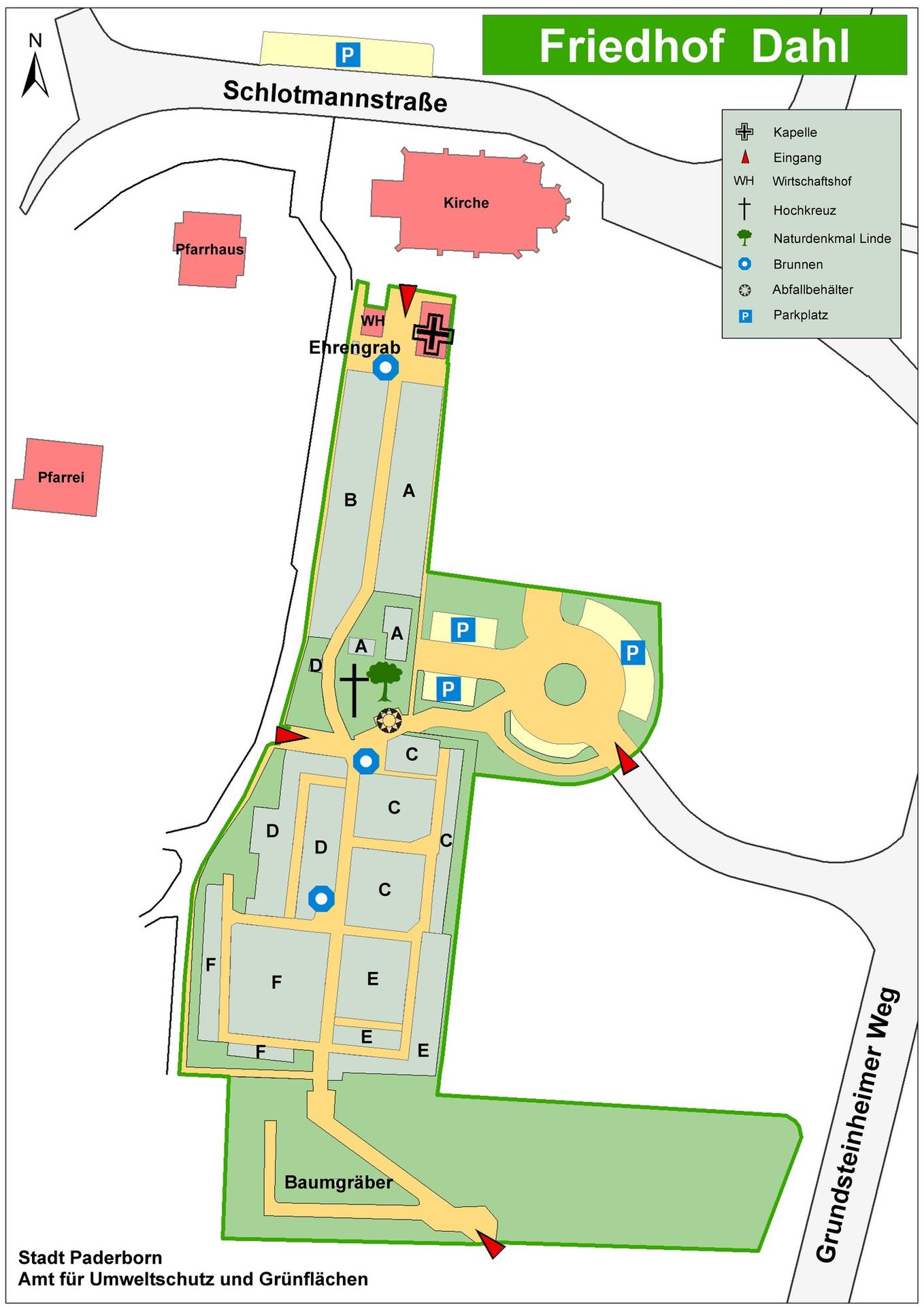 Hier finden Sie umfangreiche Informationen, einen Übersichts-Plan und die Kontaktdaten und Ansprechpartner des Friedhofs Dahl