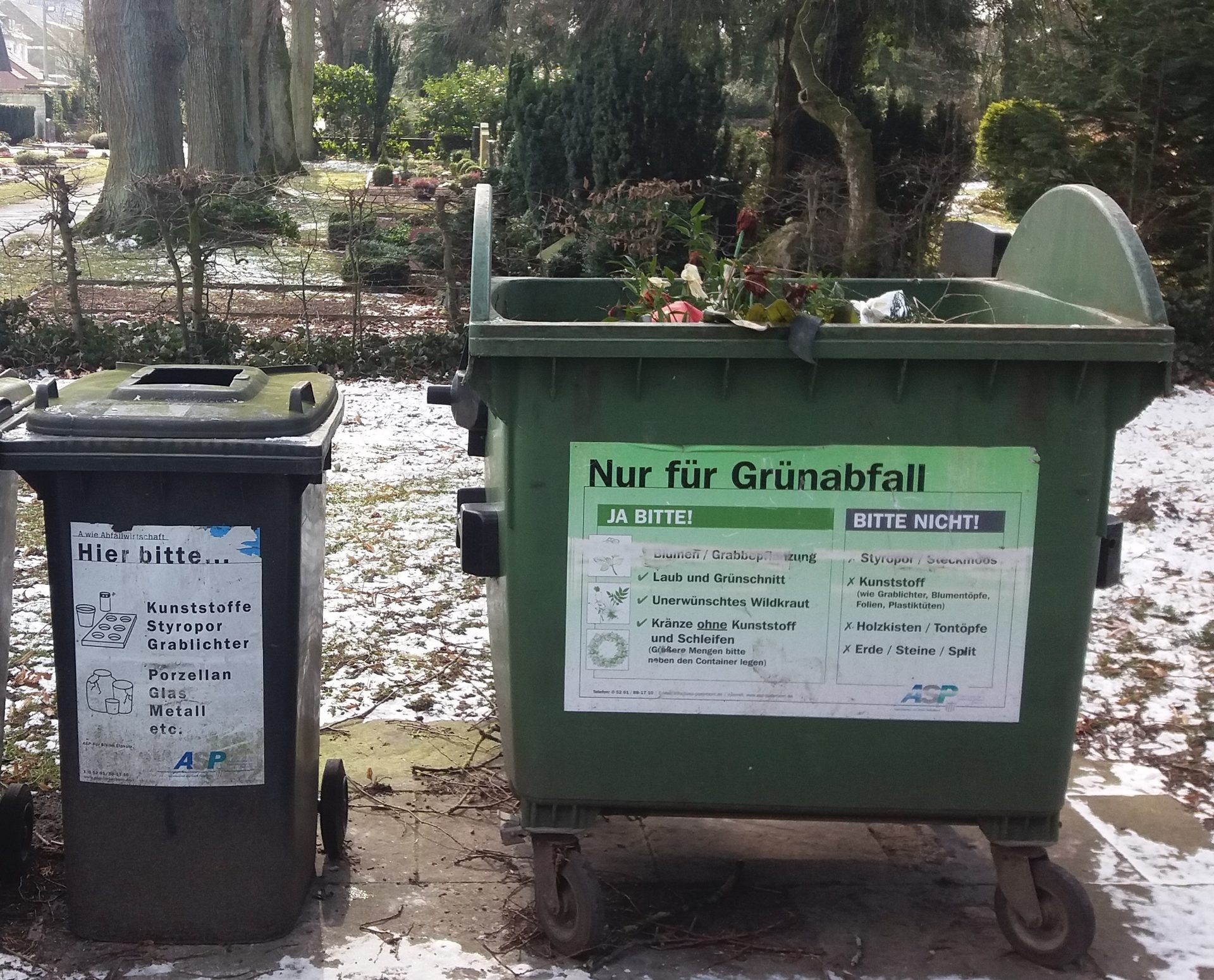 Für alle anderen Abfälle stehen Restmülltonnen bereit, da eine weitere Wertstofftrennung auf Friedhöfen nicht praktikabel ist. Wer besonders umweltbewusst ist, sollte deshalb Kunststoffverpackungen oder auch ausgebrannte Grablichter wieder mit nach Hause nehmen und im gelben Wertstoffsack entsorgen.