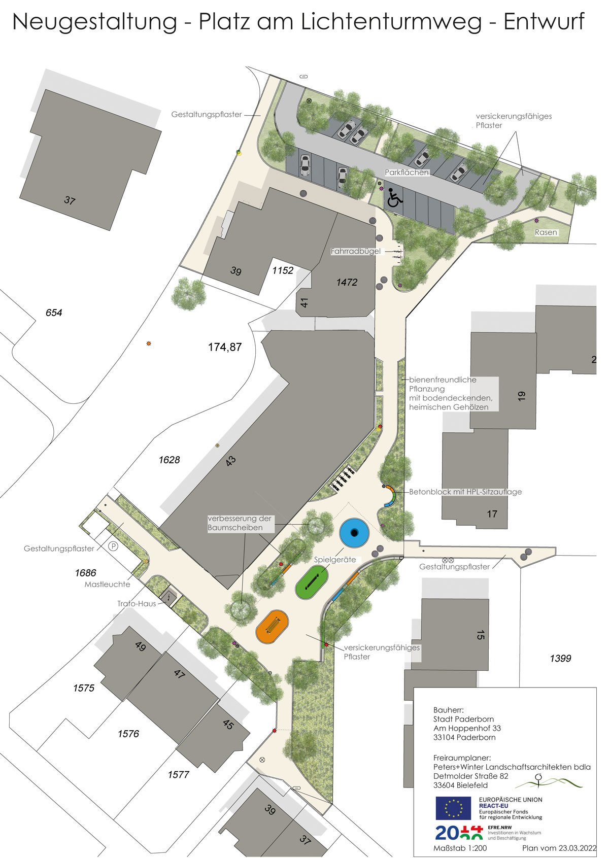 Im Detail sieht der Entwurf -unter Berücksichtigung der vorhandenen Bäume- vor einen Ort des Treffens, Spielens aber auch der Funktionalität zu schaffen.