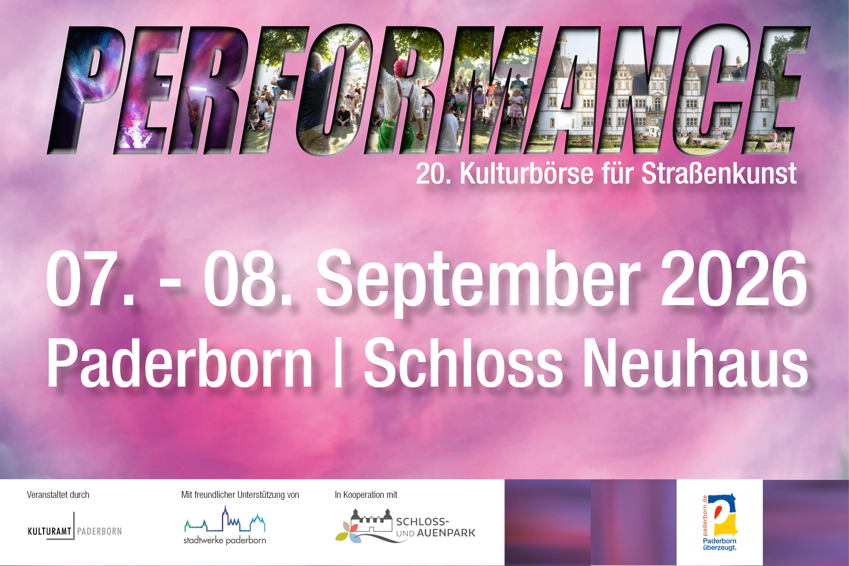 130 live performances over two days! For 19 years, Performance Paderborn has been transforming the baroque gardens of Neuhaus Castle into a colourful spectacle of artistry and street art for two days. For the 20th Performance, around 65 artists will once again be performing 130 shows in the castle grounds, on lawns and stage platforms, hanging from trapezes or bringing their own structures with them.