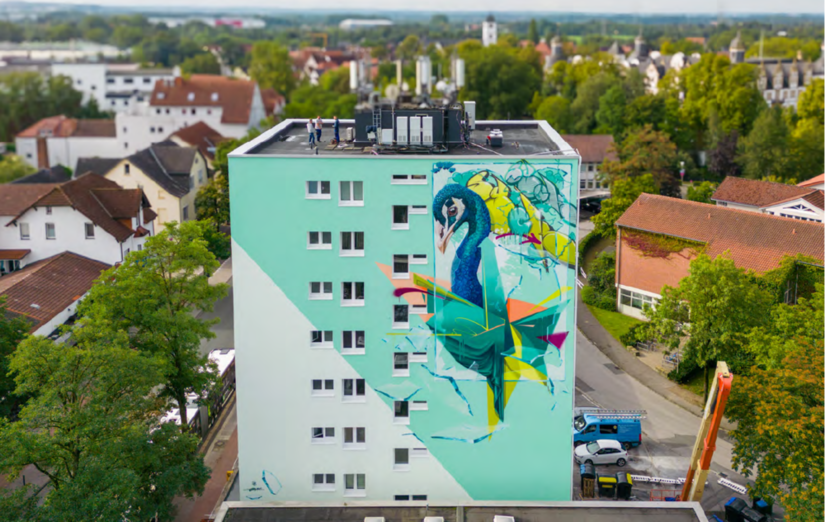 Im Jahr 836 wurden die Gebeine des Schutzheiligen Liborius von Le Mans nach Paderborn überführt. Der Sage nach flog bei dieser Überführung der Reliquien ein Pfau voran, der den Weg in das neu gegründete Bistum Paderborn angezeigt hat. Dieser tieferen Bedeutung des Pfaus für die Stadt Paderborn war sich Syck aus Bielefeld gar nicht bewusst, als er an seinem Entwurf für die Fassade in SchlossNeuhaus gearbeitet hat. Seine Ideen jedenfalls lösten wenige Kilometer südöstlich in Ostwestfalen eine große Begeisterung aus. Denis Kelle reist mit seinen Graffitis um die Welt. Auch in Paderborn war er schon häufiger an der Busdorfmauer oder bei den Jams im mittleren Paderquellgebiet zu sehen. Angefangen hat alles vor vielen Jahren mit dem sogenannten Style Writing. Hier wird der eigene Name (SYCK) immer wieder neu aus einer künstlerischen Perspektive interpretiert und großflächig auf die Wand gesprüht. 2010 machte er sich unter dem Namen „Einsyckartig“ als Wandmaler selbständig und öffnete seine Werke für zunehmend grafische und motivische Objekte. Ein Highlight war bisher dabei die Gestaltung der Außenfassade und der Spielertunnel im Fußballstadion von Arminia Bielfeld. In SchlossNeuhaus bringt er das Paderborner Wappentier in einer effektvollen Detailliertheit auf das Hochhaus. Gerahmt wird das Motiv von einer Glasscheibe, die der gut zehn Meter große Pfau durchbricht. Diese Dynamik des Wandbilds wird durch die grafischen Elemente in seiner monumentalen Wirkung hervorgehoben. In der oberen Bildhälfte kehrt Syck schließlich zu seinen künstlerischen Wurzeln zurück, in dem er die Arbeit mit seinen imponierenden Styles kombiniert. Sagenhaft!