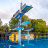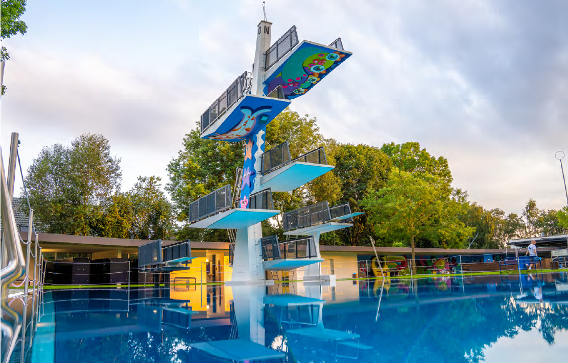 Schon bei der Begrüßung im Rolandsbad wird mir in diesem Jahr schnell klar, dass ELF und ihre Werke mittlerweile fest in Paderborn angekommen sind. „Willst du zu Petra? Die sitzt dort drüben auf der Bank“, entgegnet mir die freundliche Bademeisterin direkt am Eingang. Ihre Arbeiten im Schwimmbad sind im letzten Jahr so gut bei den Badegästen angekommen, dass die Graffiti-Künstlerin aus der Schweiz auch dieses Jahr wieder nach Paderborn gereist ist, um weitere Flächen zu gestalten. Besonders leicht fiel ihr die Entscheidung, da ELF bei der dritten Ausgabe des Festivals einen Sprungturm bemalen durfte. „Einzigartig. So eine Chance bekommt man wahrscheinlich nur einmal im Leben. Ich mag diese Herausforderungen in meinen Arbeiten.“ Die Gestaltung des Sprungturms ist besonders anspruchsvoll, da das Objekt für die Besucher:innen des Schwimmbads aus einer 360-Grad-Perspektive zu sehen ist. Die Fläche selbst musste kopfüber vom Steiger aus bemalt werden. „Im Vorfeld habe ich mir viele Gedanken gemacht. Kann ich an dem Turm überhaupt sprühen? In der Panik habe ich dann Acrylfarben und Pinsel bestellt. Auf der Hebebühne habe ich dann gemerkt, dass sich meine Figuren am Objekt gut sprühen lassen. Am Ende war es easy und ich habe beide Techniken miteinander gemischt.“ Im Mittelpunkt der Arbeit steht ein großer Karpfen, den ELF auf die Unterseite des Sprungbretts gemalt hat. Typisch für ihren Stil sind die knallbunten und kontrastreichen Farben mit großen Glubschaugen, die mich ein wenig an die fröhlichen Figuren aus der Sesamstraße erinnern. Die Motive werden zunächst digital auf dem Tablet entworfen und anschließend mit Sprühdosen und Pinseln an das Objekt und seine Umgebung angepasst. Auch in diesem Jahr gab es zahlreiche Besuche von den stetig wachsenden ELF-Ultras. „Es ist total nice, die Leute wiederzutreffen. Es ist schon fast, wie wieder nach Hause zu kommen.“