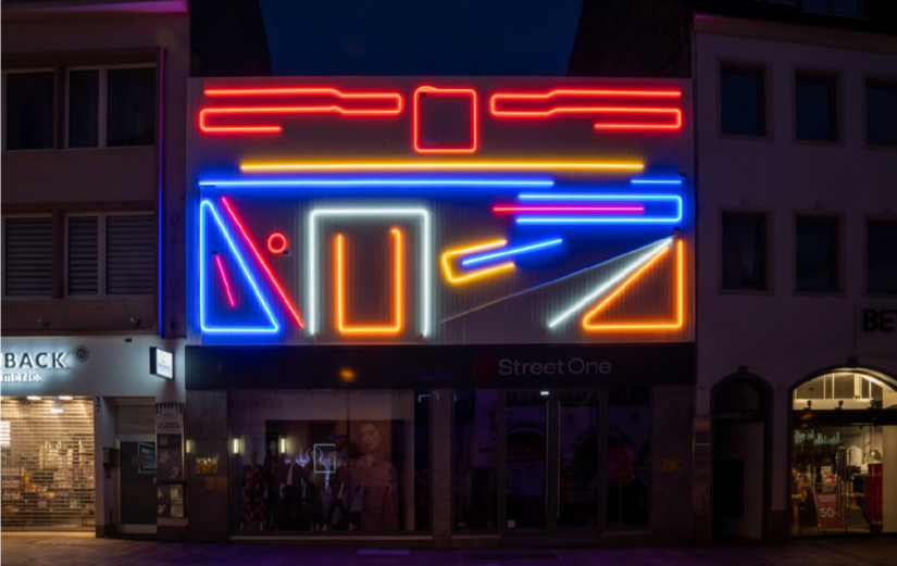 Es ist Samstagabend in Partyborn. Die ersten Party-People laufen bereits in kleinen Gruppen durch die Innenstadt zu den Bars und Clubs der Stadt. Die Türen der Geschäfte in der Westernstraße sind schon geschlossen. Trotzdem sammelt sich eine kleine Menschentraube am Marienplatz. Alle Augen sind neugierig auf die große Wand über dem Bekleidungsgeschäft Street One gerichtet. „Ist das ein neuer Club? Wann macht der auf?“, fragt einer der flanierenden Halbstarken. In wenigen Minuten wird die neue Lichtinstallation von Spidertag zum ersten Mal aktiviert. Von jetzt an können die Paderborner:innen immer in den Abendstunden ein interaktives Neon Mural bestaunen. Für Spidertag ist es bereits die 17. Installation dieser Art. Der Lichtkünstler aus Madrid war bei der Premiere im August selbst vor Ort. Er trug eine schwarze Sturmmaske mit hell leuchtenden Buchstaben auf der Stirn. Zu lesen war der Schriftzug „NEON“. Über das Handy ging es dann live auf Insta. Hier begrüßte Spidertag sein internationales Publikum auf Spanisch und Englisch. Hinter seinen #INMs (Interactive Neon Mural) steckt keine tiefere Botschaft. Vielmehr basiert die Anordnung der Neons auf den Prinzipien der Geometrie und der Farbkomposition, auf deren Basis jeweils eine ausdruckstarke Balance und Harmonie erschaffen wird. Der besondere Clou: Einzelne Elemente können vom Zuschauer per App angesteuert werden. Über einen QR-Code an der Fassade erhält man Zugriff auf die Neons. Hiermit lassen sich beispielsweise die Farben bestimmter Röhren live ändern