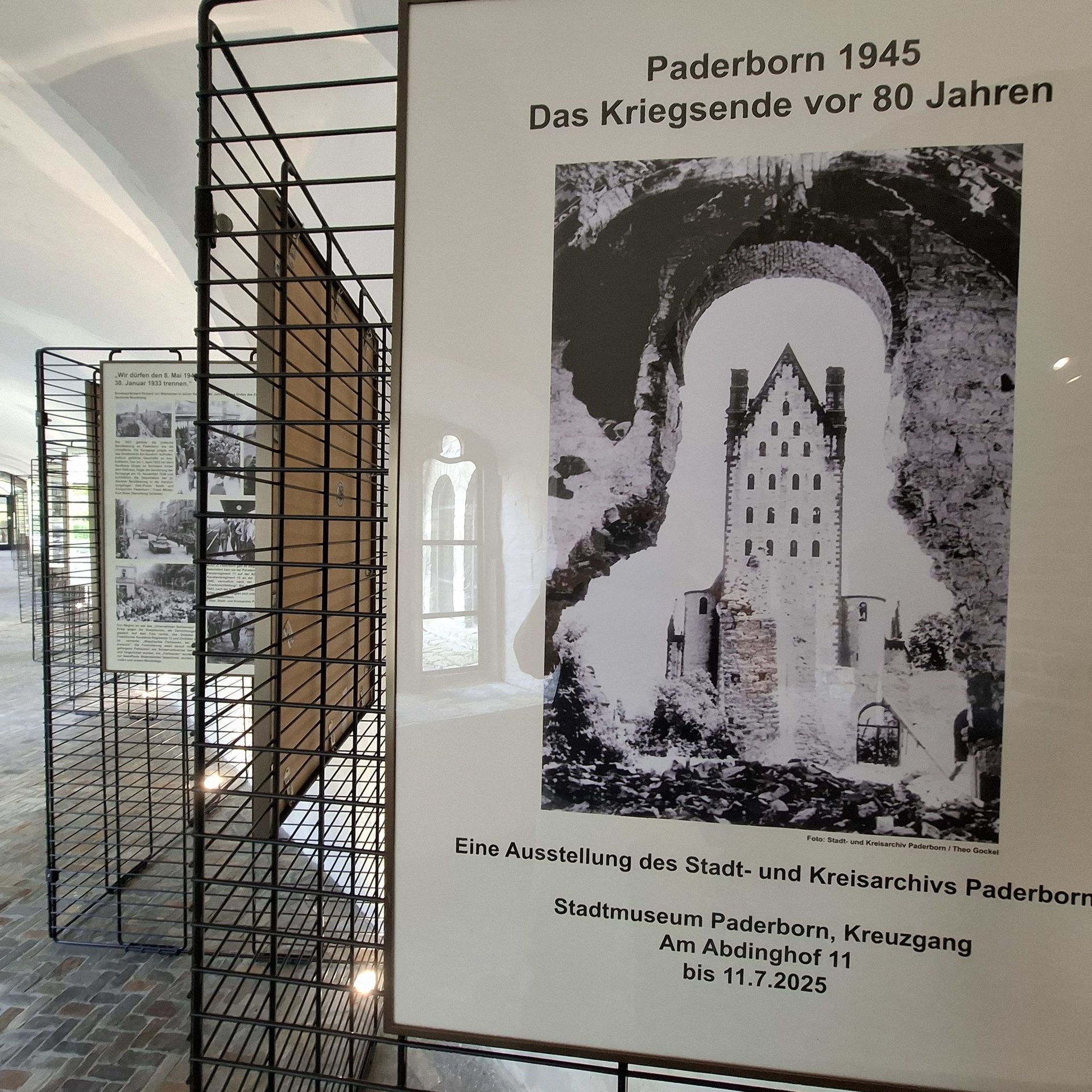 Das Stadt- und Kreisarchiv präsentierte im Stadtmuseum auf 13 Bildtafeln historische Fotos zum Kriegsende in Paderborn. Vor 80 Jahren endete der Krieg für die Stadt Paderborn mit einer großflächigen Zerstörung der historischen Innenstadt; aber auch mit der Befreiung vom NS-Regime durch die britischen Besatzungstruppen. Die Ausstellung dokumentierte die Garnisonsstadt, den Luftkrieg, die Zerstörung, das Leben in den Trümmern und erste Maßnahmen der Trümmerbeseitigung.