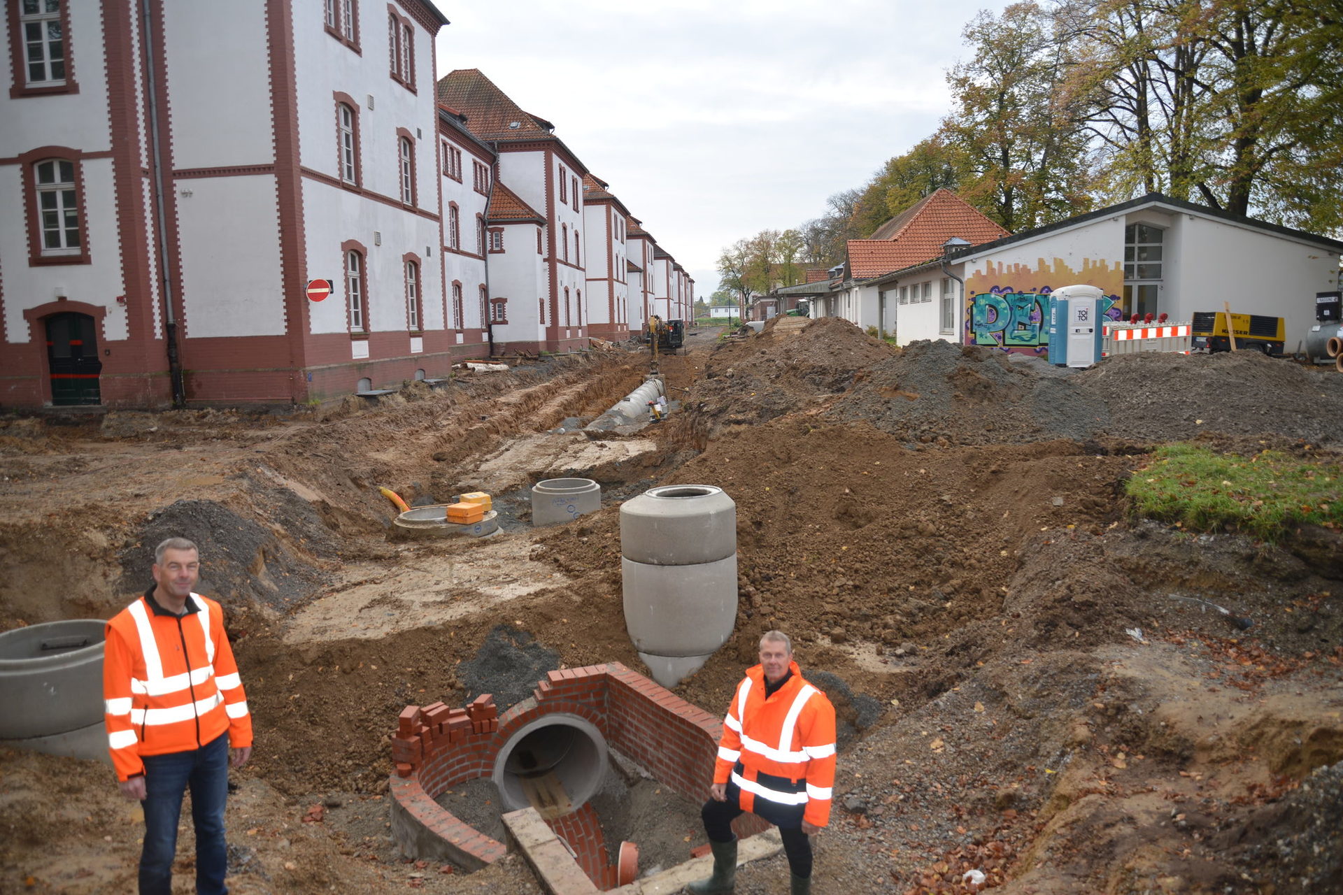 Um insbesondere die denkmalgeschützten Gebäude frühzeitig vermarkten und umbauen zu können, haben die Erschließungsarbeiten im Denkmalbereich bereits im September 2019 begonnen und laufen parallel zu den Rückbauarbeiten weiter. Im ersten Bauabschnitt im Denkmalbereich werden zurzeit 3.650 Quadratmeter neue Baustraße in Asphaltbauweise hergestellt. Darüber hinaus werden dort jeweils rund 580 Meter Schmutzwasser- und Regenwasserkanäle durch den Stadtentwässerungsbetrieb Paderborn (STEB) neu verlegt. Anschließend werden die beiden Erschließungsbügel gemeinsam mit den Schmutz- und Regenwasserkanälen für das Gesamtgelände gebaut.