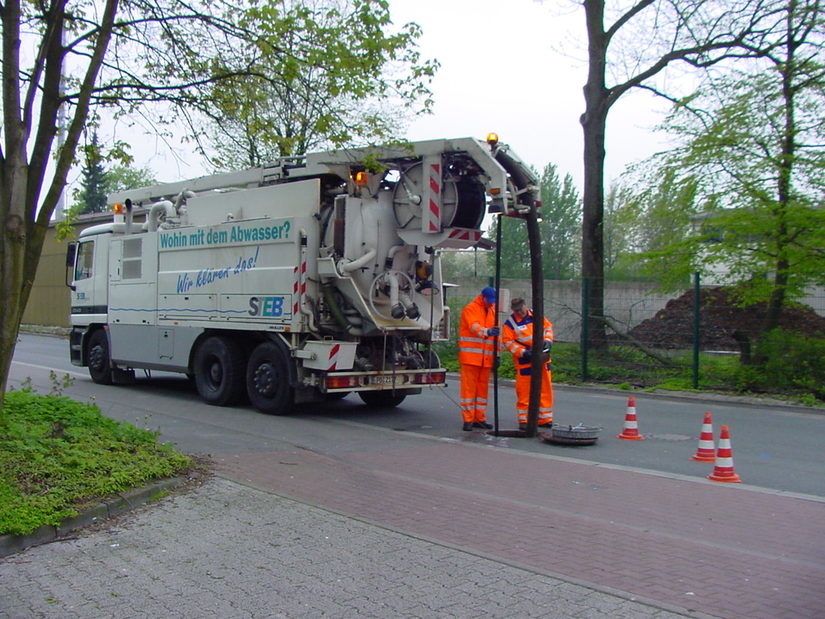 Eine Kerntätigkeit der Kanalunterhaltung ist die regelmäßige Reinigung der Kanäle. Dafür stehen dem STEB drei eigene Spül- und Saugfahrzeuge zur Verfügung, von denen eins mit modernster Wasserrückgewinnungstechnik ausgerüstet ist.