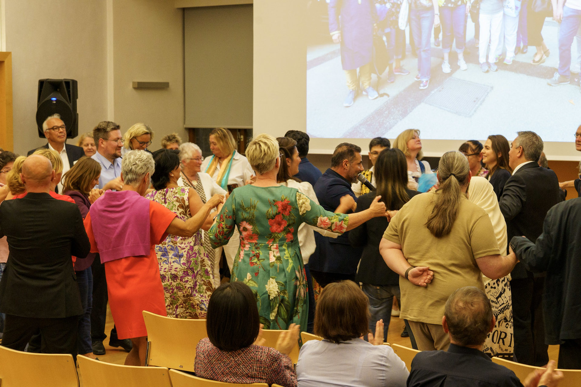 Oana Nechiti, Leiterin der Tanzschule Millenium, erklärte im Gespräch mit Michaela Weigel (Abteilung Soziale Teilhabe der Stadt Paderborn), was Tanzen mit dem Grundgesetz zu tun hat: „Tanzen ist Freiheit. Beim Tanzen können wir unsere Meinung frei ausdrücken.“