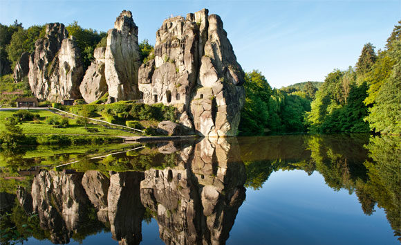 On the Southeastern edge of the Teutoburg Forest, near Horn-Bad Meinberg, the impressive Externsteine rise up. This natural monument comprises 13 sandstone rocks that have been shaped through weathering.