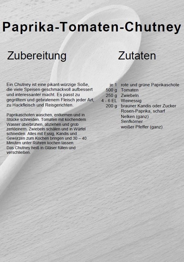 Sie befinden sich hier:StartseiteRezepteFrühlingsrezeptePaprika-Tomaten-Chutney Paprika-Tomaten-Chutney Die Soße macht´s ... © Stadt PaderbornRezept für Paprika-Tomaten-Chutney