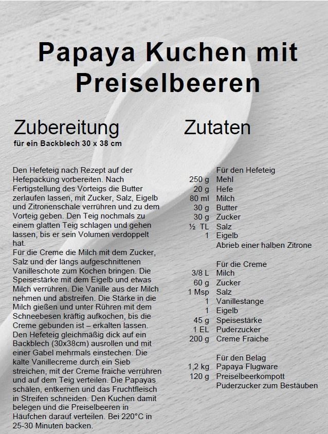 Sie befinden sich hier:StartseiteRezepteSommerrezeptePapaya Kuchen mit Preiselbeeren Papaya Kuchen mit Preiselbeeren Rezept für 12 Portionen. © Stadt Paderborn