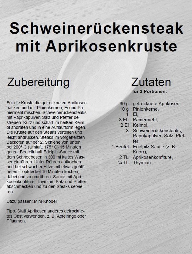 Sie befinden sich hier:StartseiteRezepteSommerrezepteSchweinerückensteak mit Aprikosenkruste Schweinerückensteak mit Aprikosenkruste Rezept für drei Portionen: © Stadt Paderborn