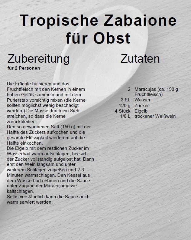 Sie befinden sich hier:StartseiteRezepteSommerrezepteTropische Zabaione für Obst Tropische Zabaione für Obst Rezept für zwei Personen. © Stadt Paderborn
