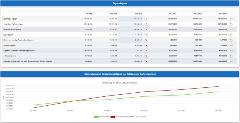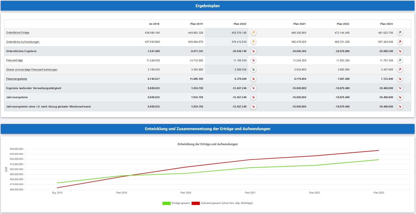 Mit dem sogenannten interaktiven Haushalt können über unterschiedliche Sichtebenen hinweg Daten tabellarisch und grafisch aufbereitet werden. Alle wesentlichen Informationen sind so auf einen Blick erkennbar; bei Bedarf können durch gezielte Mausklicks weitergehende Details dargestellt werden.