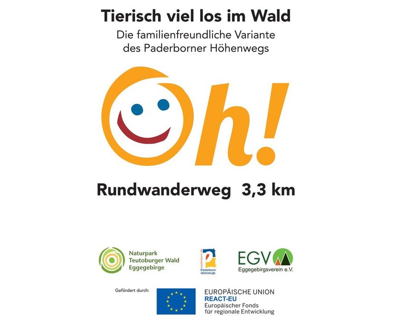 Die gut drei Kilometer lange „familienfreundliche Variante des Paderborner Höhenwegs“ macht unter dem Motto „Tierisch viel los im Wald“ auf kurzweilige Weise mit den typischen Tieren im Buchenwald bekannt. Da taucht beispielsweise plötzlich eine Bache mit ihren Frischlingen auf oder zwei Dachse schauen den jungen Entdeckern vom Wegrand zu. Eichhörnchen klettern auf der Förster-Funke-Eiche herum, ein kapitaler Hirsch reckt sich majestätisch aufrecht und eine Fledermaus hängt träge im Baumwipfel.
