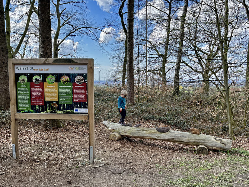 Stets den Schildern mit dem Aufdruck „Oh“ und einem lächelnden Gesicht folgend erfahren die Kinder – und die Erwachsenen – auch an den weiteren sieben Stationen viel Interessantes über das Leben im Wald. Nachdem auf großformatigen Informationstafeln die typischen Waldtiere vorgestellt wurden, steht das aktive Entdecken im Vordergrund: So sollen die Kinder beispielsweise möglichst leise durch das Unterholz schleichen oder ein Stück weiter die Fortbewegungswiesen von Tieren nachahmen. An einer Hörstation können sie den Stimmen der Waldtiere lauschen. Zudem fordern ein großes Klettergerüst über zwei umgestürzte Bäume und ein Balancierbalken die Geschicklichkeit der Kinder heraus.