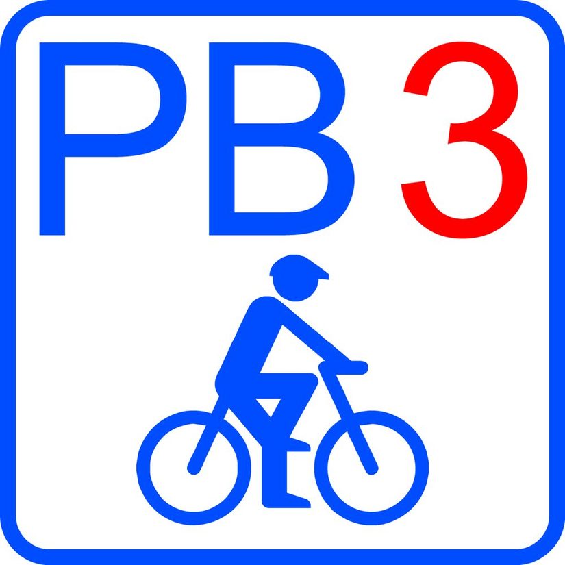 Weißes Schild mit blau-rotem Aufdruck »PB 3« und einem Radfahrersymbol. Die Tour Haxterberg und Almetal ist in beide Richtungen beschildert. Die Schilder befinden sich als sog. "Einschübe" unter den rot-weißen Armwegweisern des landesweiten Radverkehrsnetzes Nordrhein-Westfalens.