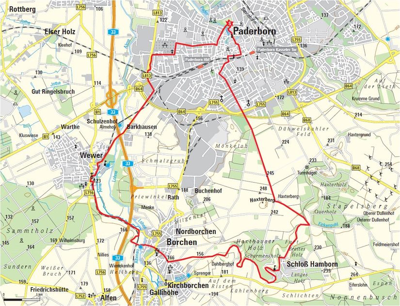 Maspernplatz – Flugplatz Haxterberg (5,5 km) - Schloss Hamborn (9 km) – Mallinckrodthof Borchen (15 km) - Wewer (18 km) - Maspernplatz (25 km).