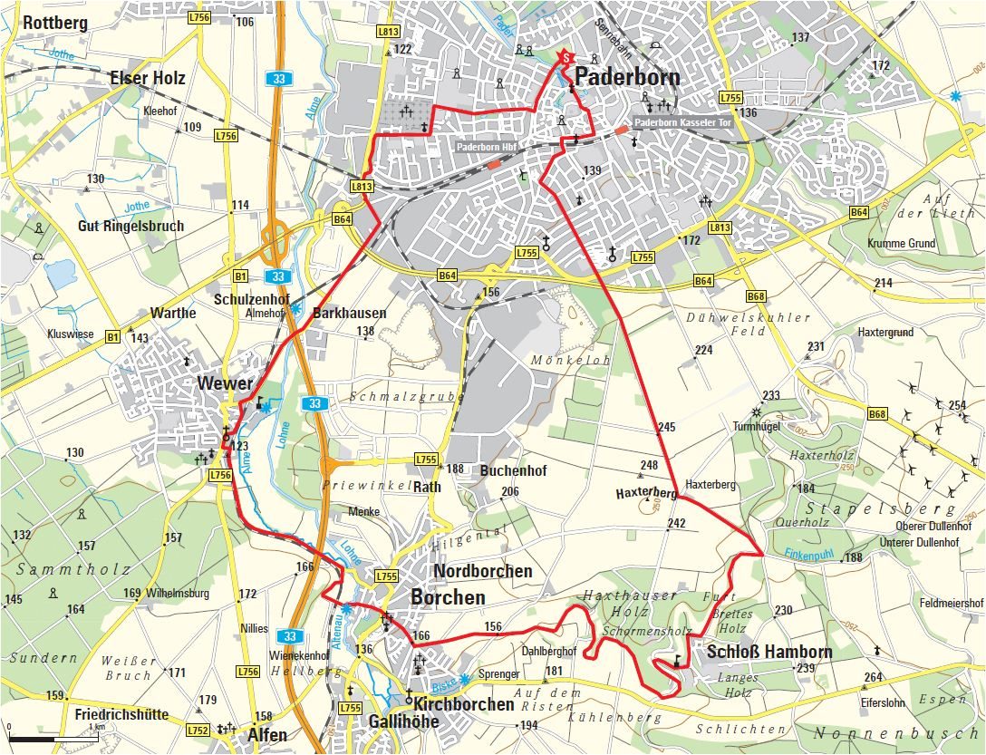 Die ersten sechs Kilometer verlangen sportlichen Einsatz: Von der Paderborner Innenstadt bis zum Flugplatz Haxterberg sind rund 130 Höhenmeter zu bewältigen. Recht steil ist danach die Abfahrt in den Haxtergrund hinab. Doch geht es bis zum Ende der Rundtour relativ gemütlich weiter. Idyllisch ist der Abschnitt entlang des Ellerbachs über Schloß Hamborn in Richtung Borchen. Die Alme begleitet anschließend den Rückweg bis kurz vor Paderborn. Am Westfriedhof vorbei und durch den Riemekepark ist alsbald der Ausgangspunkt am Maspernplatz wieder erreicht.
