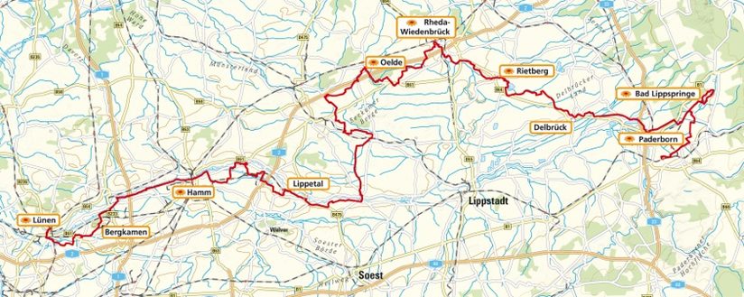 Paderborn - Bad Lippspringe (19 km) - Delbrück (42 km) - Rietberg (57 km) - Rheda-Wiedenbrück (69 km) - Oelde (90 km) - Lippetal (121 km) - Hamm (157 km) - Bergkamen (175 km) - Lünen (186 km).