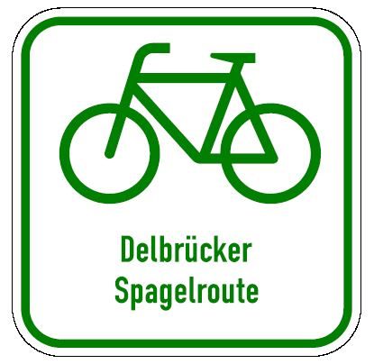 Rechteckiges Schild mit dem Schriftzug " Delbrücker Spargelroute" und einem Fahrrad als Symbol; grüner Druck auf weißem Grund. Beschildert in beiden Richtungen. Die Schilder befinden sich als sog. "Einschübe" unter den rot-weißen Armwegweisern des landesweiten Radverkehrsnetzes Nordrhein-Westfalens.