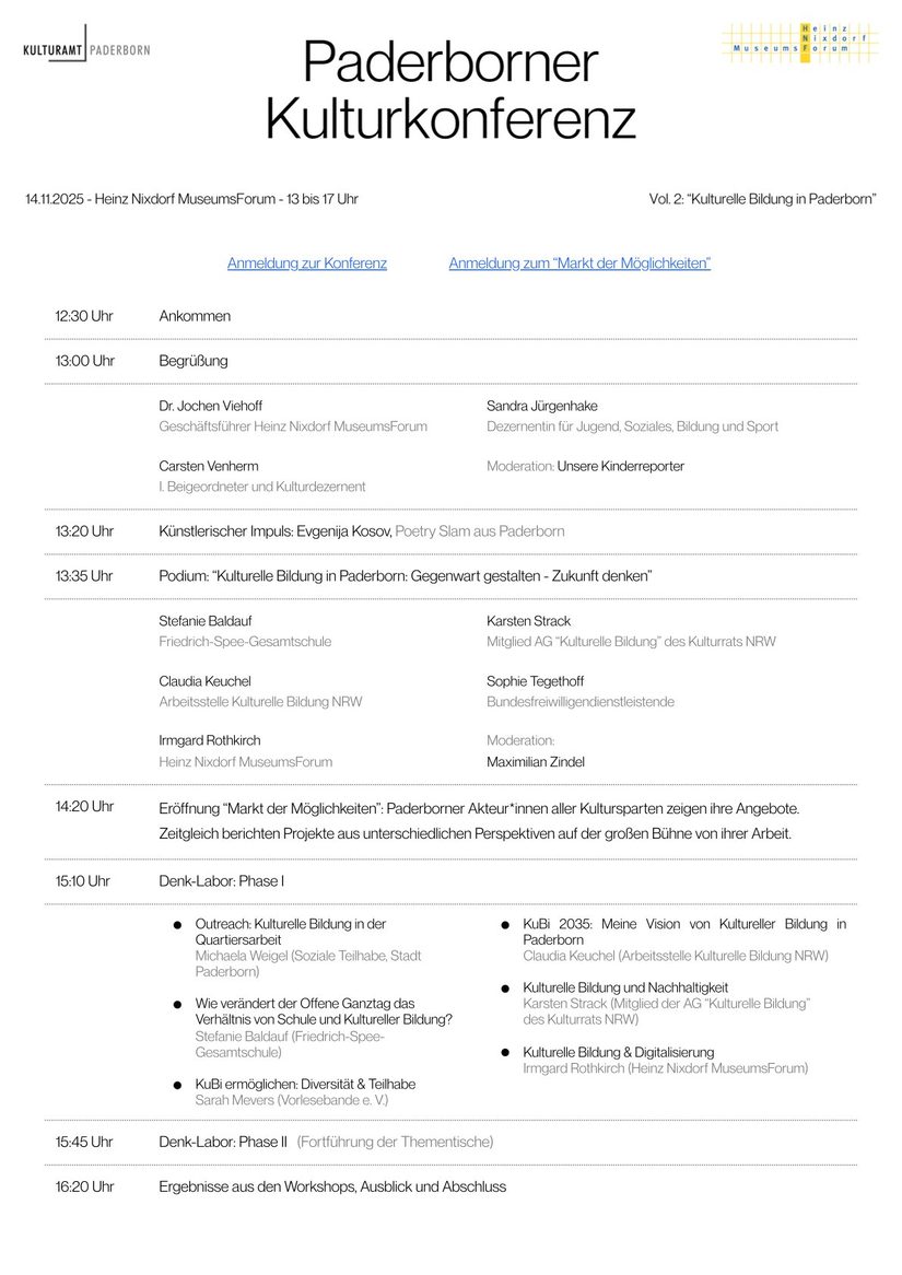 Um über die Möglichkeiten in und für Paderborn zu sprechen, veranstaltet das Kulturamt in enger Zusammenarbeit mit dem Heinz Nixdorf MuseumsForum die zweite Paderborner Kulturkonferenz, zu der wir Sie herzlich einladen möchten: