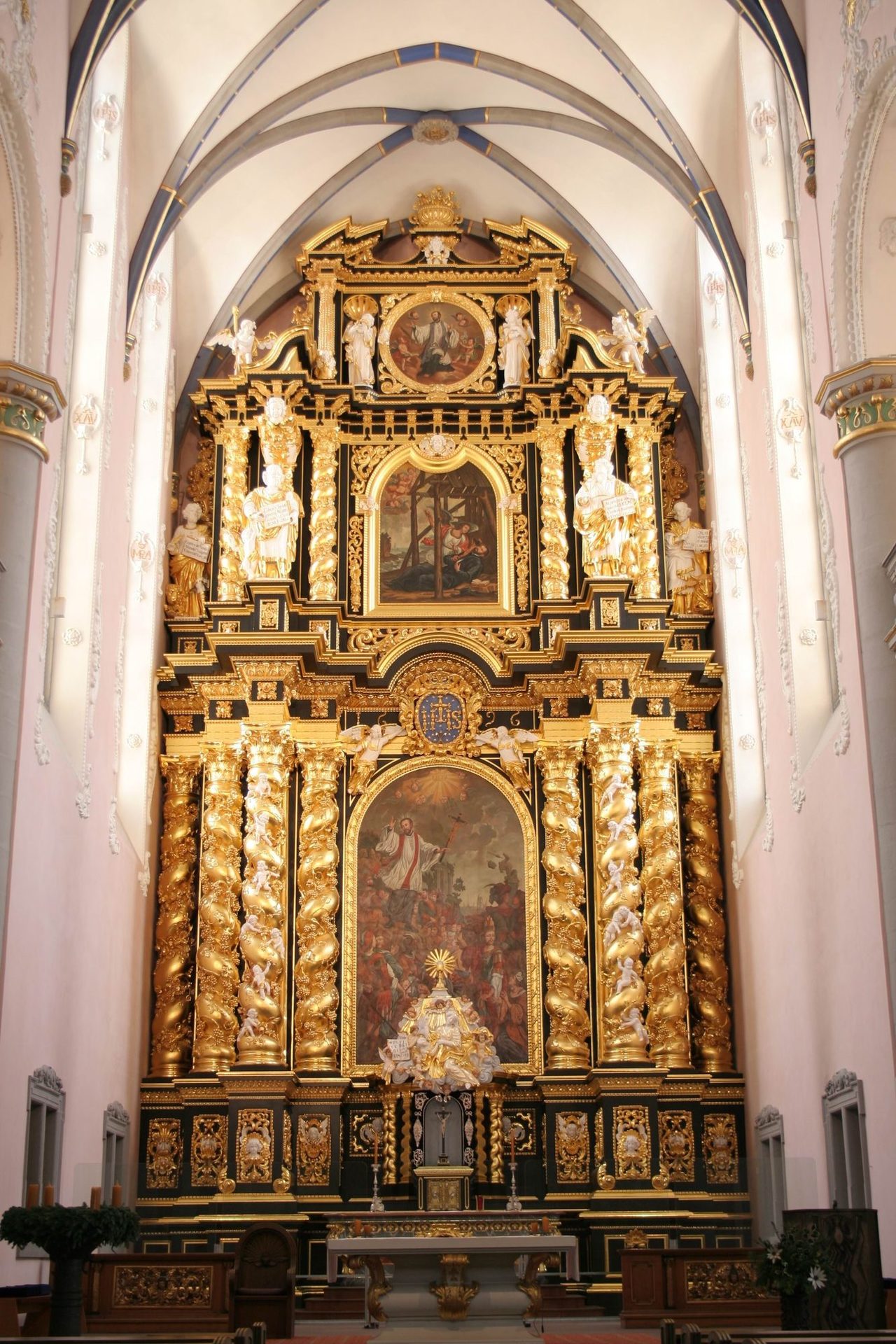 In den ersten Jahren stand den Jesuiten als Kirche die Bartholomäuskapellle zur Verfügung, ab 1604 konnten sie die wieder in Stand gesetzte Johanniskirche nutzen, die ehemalige Kirche der Minoriten. Auf Dauer reichte das Raumangebot des Gotteshauses jedoch nicht aus, denn es diente zugleich auch als Gymnasial- und Universitätskirche. Ein größerer Neubau war erforderlich. Durch schwere Erkrankung zur Ablegung eines Gelübdes zu Ehren der Jungfrau Maria und des hl. Franz Xaver veranlasst und danach genesen, erwarb Fürstbischof Ferdinand 1677 westlich des Kollegs ein Grundstück für den Neubau einer Kirche. Nachdem Verhandlungen mit dem Architekten Antonio Petrini aus Trient nicht zum Erfolg geführt hatten, wurde das Projekt dem im Kirchenbau erfahrenen Jesuitenbruder Anton Hülse übertragen. Der Bau begann 1682, war 1686 im Rohbau fertig gestellt und konnte 1692 geweiht werden. Die Innenausstattung der dreischiffigen barocken Emporenbasillika war erst 1730 mit Fertigstellung der Orgel vollendet (Altar 1696, Kanzel 1704). Der Stifter erlebte nur noch die erste Bauphase - er starb bereits 1683. Die Johanniskirche, sie stand auf dem heutigen Schulhof des Gymnasiums Theodorianum, wurde 1728 abgebrochen.