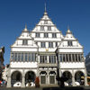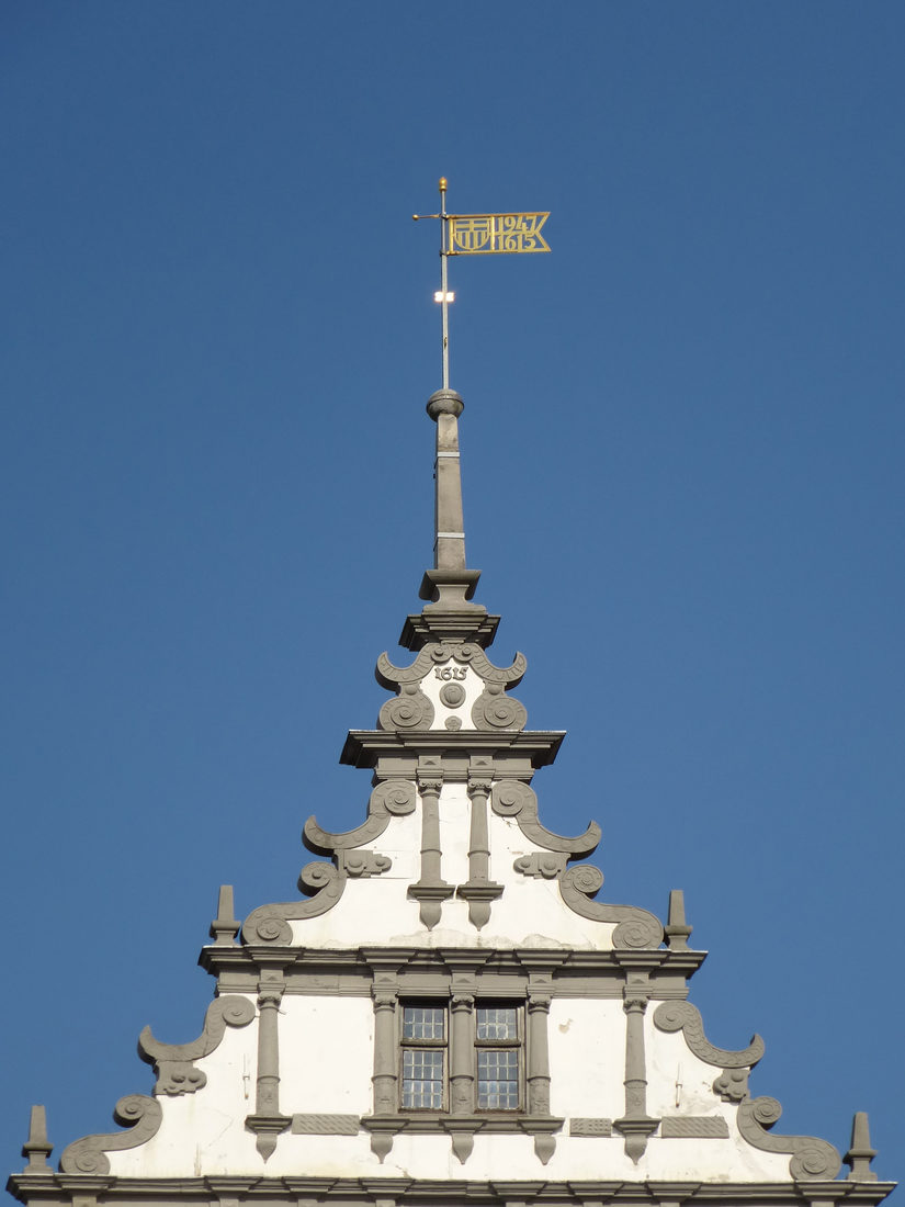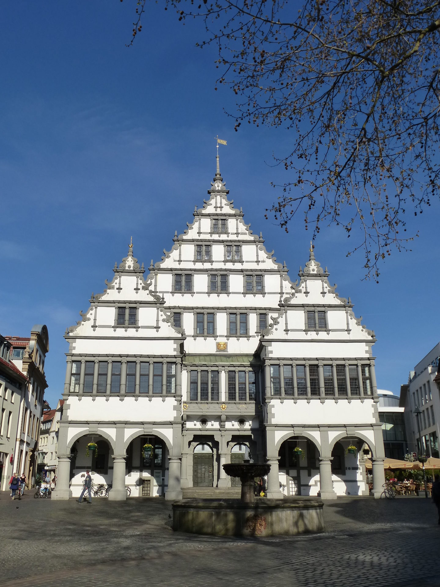 Das Paderborner Rathaus mit seinen drei Giebeln ist ein Paradebeispiel für die Baukunst der Weserrenaissance. Besonders typisch ist das Obergeschoss mit seinen zahlreichen Fenstern.