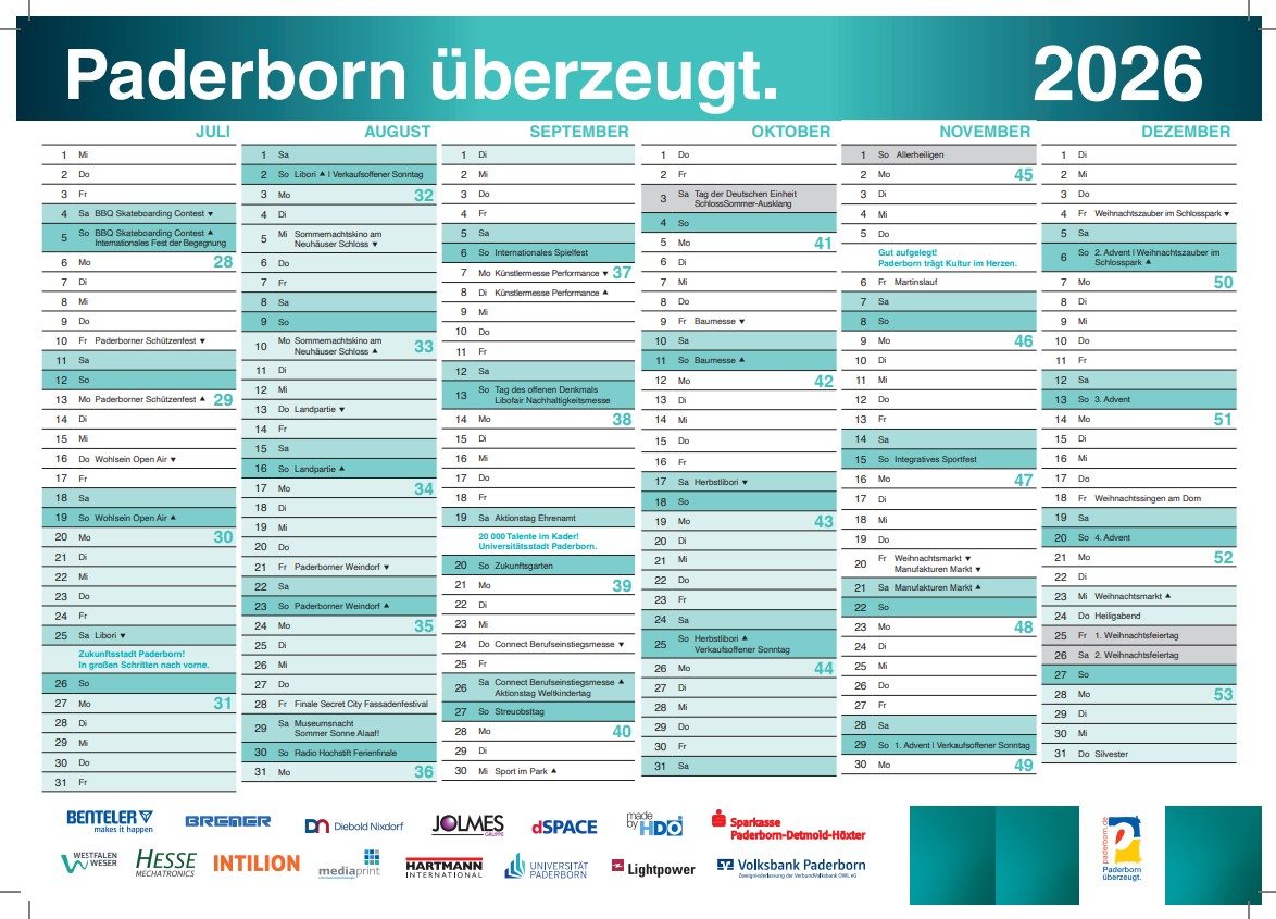 Hier präsentieren wir Ihnen die Paderborner Veranstaltungshighlights im Jahr 2026. Freuen Sie sich u.a. wieder auf Traditionsveranstaltungen sowie Messen, Events, Sport-, Kirmes- und weitere Marktveranstaltungen im Jahresverlauf.