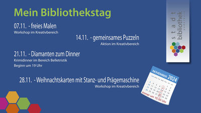 Am Donnerstag, den 14. November, wollen wir uns ab 15 Uhr in der Kreativetage der Zentralbibliothek zum gemeinsamen Puzzeln treffen. Zur Verfügung stehen verschiedene Motive mit 500 oder 1000 Teilen, runde Puzzle und sogar Holzpuzzle, so ist für jeden etwas dabei.