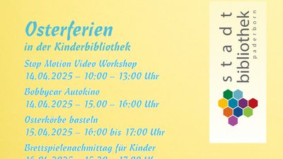 Die Veranstaltung findet am 15.04. von 16:00 Uhr bis 17:00 Uhr in der Kinderbibliothek statt und richtet sich an Kinder ab fünf Jahren.