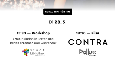 Als besonderes Highlight erhalten die ersten 35 Teilnehmenden Gratis-Kinotickets für den Film "Contra" von Sönke Wortmann aus dem Jahr 2021. Der Film wird im Anschluss des Workshops um 18:30 Uhr im Pollux, Westernstraße 34, gezeigt. Interessierte werden gebeten, sich im Voraus unter www.bibliothek.live anzumelden.