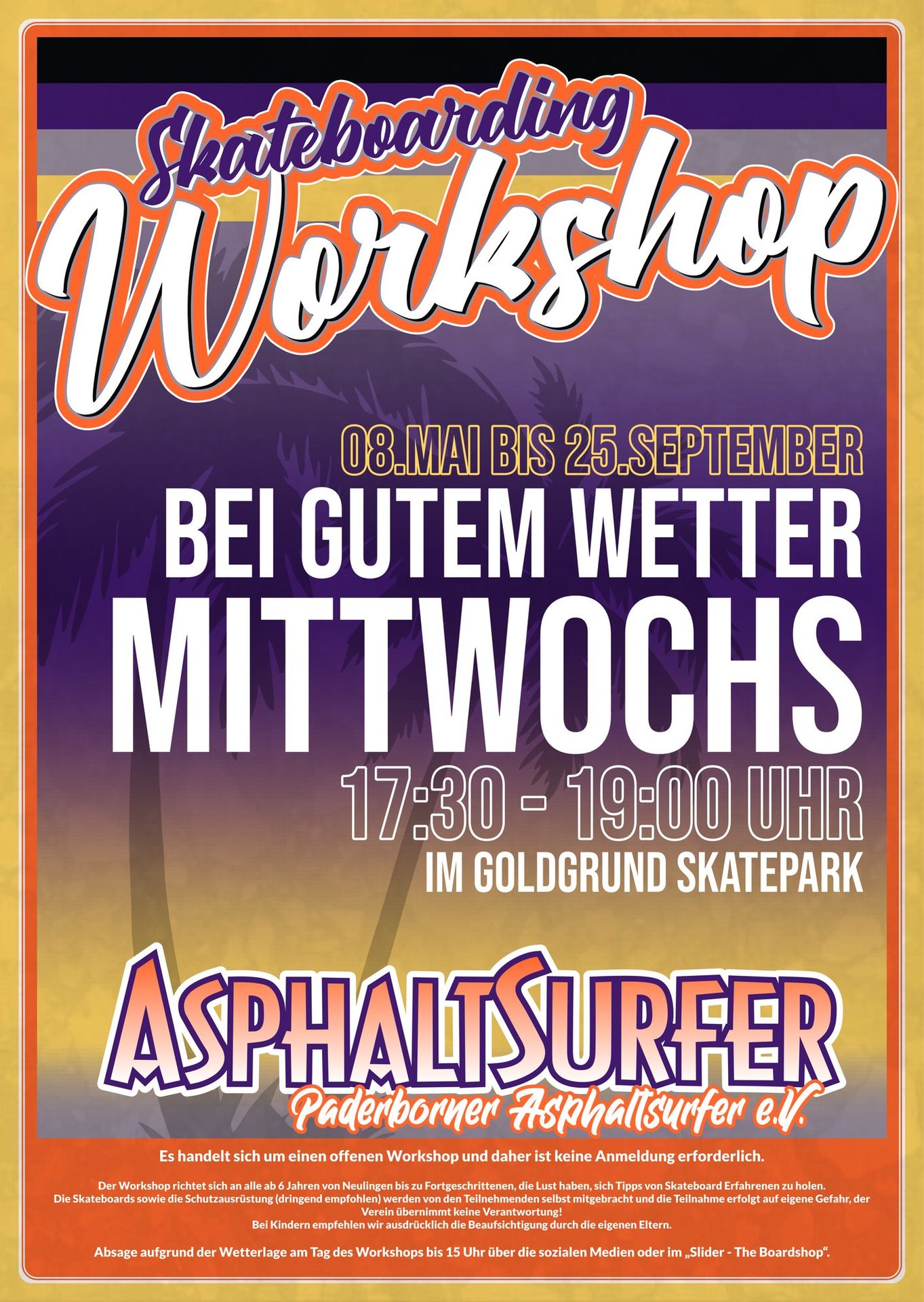 Der Paderborner Asphaltsurfer e.V. bietet in den Sommermonaten einen Skateboarding-Workshop im Skatepark Goldgrund an. Dieser findet bei gutem Wetter noch bis zum 25. September, immer mittwochs ab 17.30 Uhr, statt. Ziel des Workshops ist es, Skateboard-interessierten Menschen aller Altersgruppen ab sechs Jahren den Einstieg in die Skateszene zu erleichtern.
