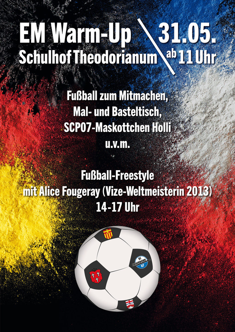 Zusammen mit dem SCP wird es ein kleines Fußballfest für Groß und Klein geben. Verschiedene Fußballangebote laden zum Mitmachen ein, so kann man zum Beispiel messen, wie schnell der eigene Torschuss ist oder einen Fußballparcours absolvieren. Außerdem wird um 14 Uhr der erste französische Fußballstar eintreffen. Alice Fougeray, Top-Act der europäischen, wenn nicht weltweiten Fußball-Freestyle-Spitzenklasse. Die ehemalige Vize-Weltmeisterin ihres Faches wird von 14 bis 17 Uhr ihre Künste auf dem Schulhof des Theodorianums darbieten und auch interessierten Nachwuchs-Fußballer*Innen einige ihrer Tricks beibringen und für Fotos und Autogramme bereitstehen.