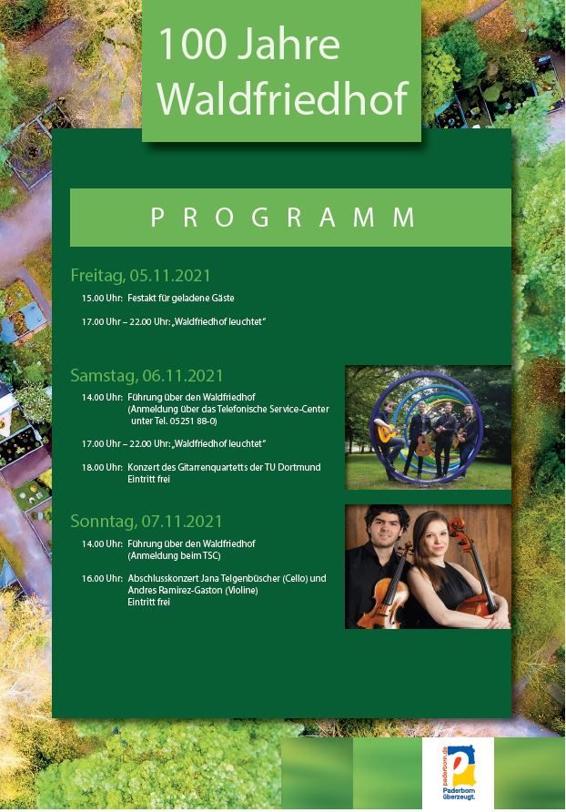 Sie befinden sich hier:StartseiteTourismus KulturVeranstaltungenVeranstaltungskalender100 Jahre Waldfriedhof Schloß Neuhaus 100 Jahre Waldfriedhof Schloß Neuhaus VeranstaltungsortVeranstalter Veranstaltungsinformationen07. November 2021 – 07. November 2021© Stadt PaderbornPlakat zur JubiläumsveranstaltungVeranstaltungsort Waldfriedhof Schloß Neuhaus Veranstalter Stadt Paderborn - Amt für Umweltschutz und Grünflächen