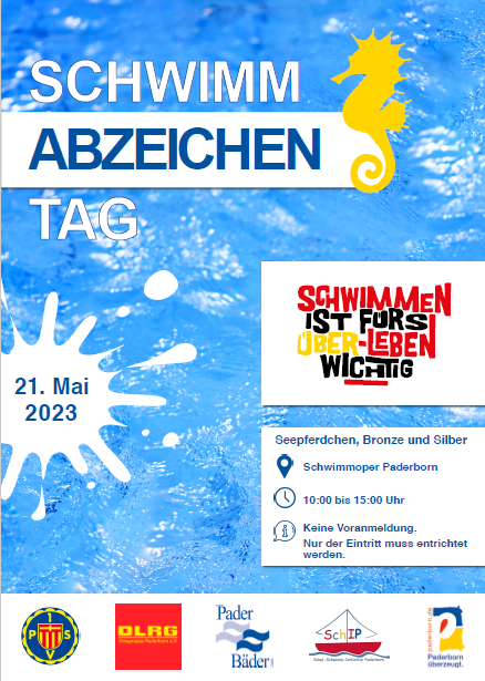 Am Sonntag, den 21. Mai 2023 findet der bundesweite Schwimmabzeichen-Tag statt. An diesem Tag laden die DLRG Ortsgruppe Paderborn e.V. und die Vereinsjugend des 1. Paderborner Schwimmvereins von 1911 e.V. in Kooperation mit den PaderBädern und dem Paderborner Sportservice herzlich von 10:00 - 15:00 Uhr in die Schwimmoper (Schützenweg 1b, 33102 Paderborn) ein.
